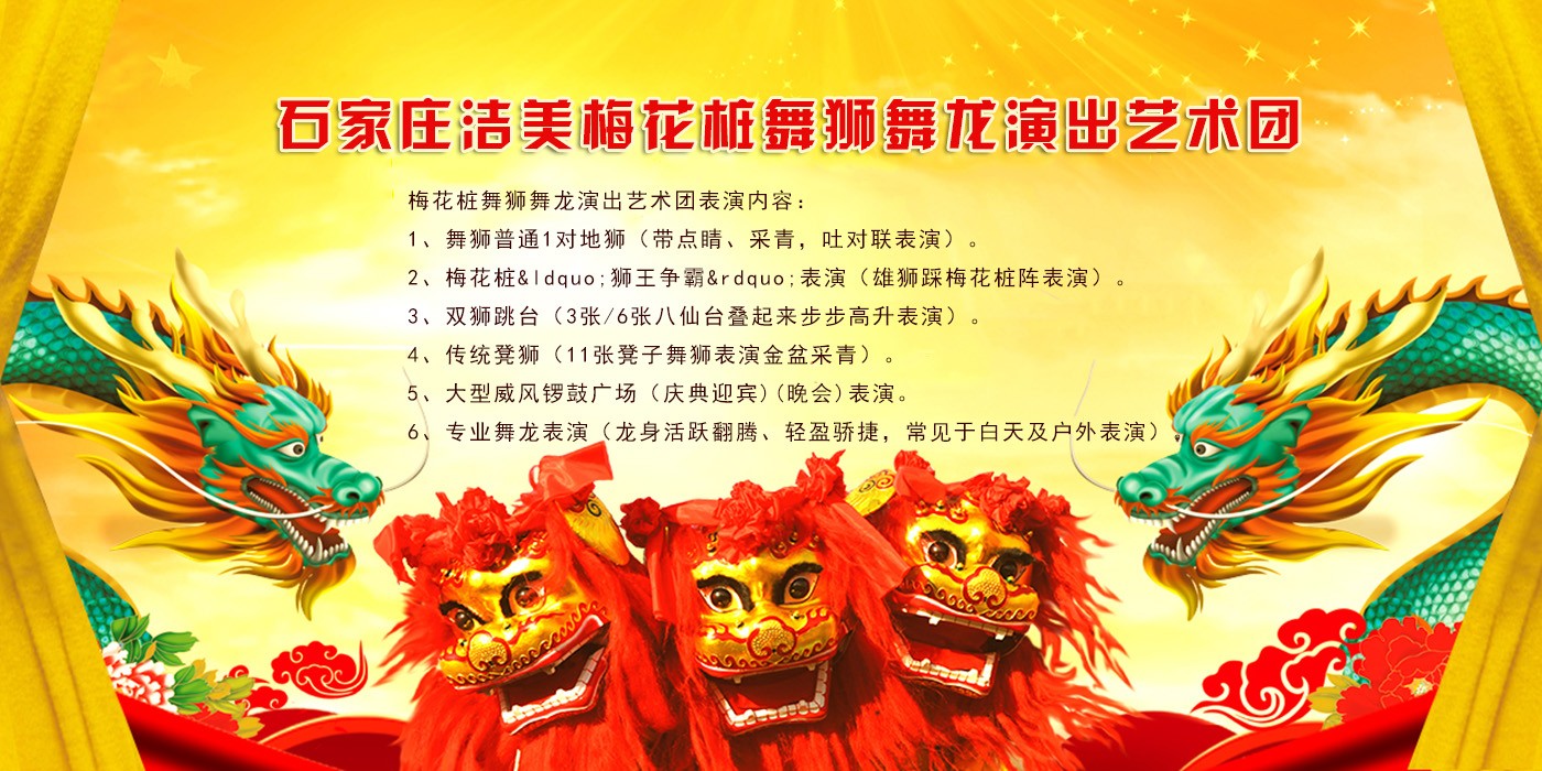 邢台梅花桩舞狮舞龙演出艺术团是邢台工商部门批准的正规演出团体.我们道具,阵容强大,信誉.多次参加比赛交流,均获得骄人的成绩和好评。